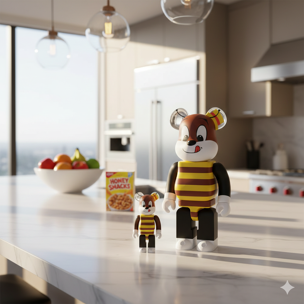 This Bearbrick set is part of a limited release, enhancing its desirability among collectors. The collaboration with Kellogg’s adds a layer of nostalgia, making it an attractive piece for those who appreciate the fusion of contemporary art toys with classic brand imagery. The meticulous design pays homage to the Honey mascot’s role in breakfast culture, capturing its playful charm and adding a touch of whimsy to any collection.