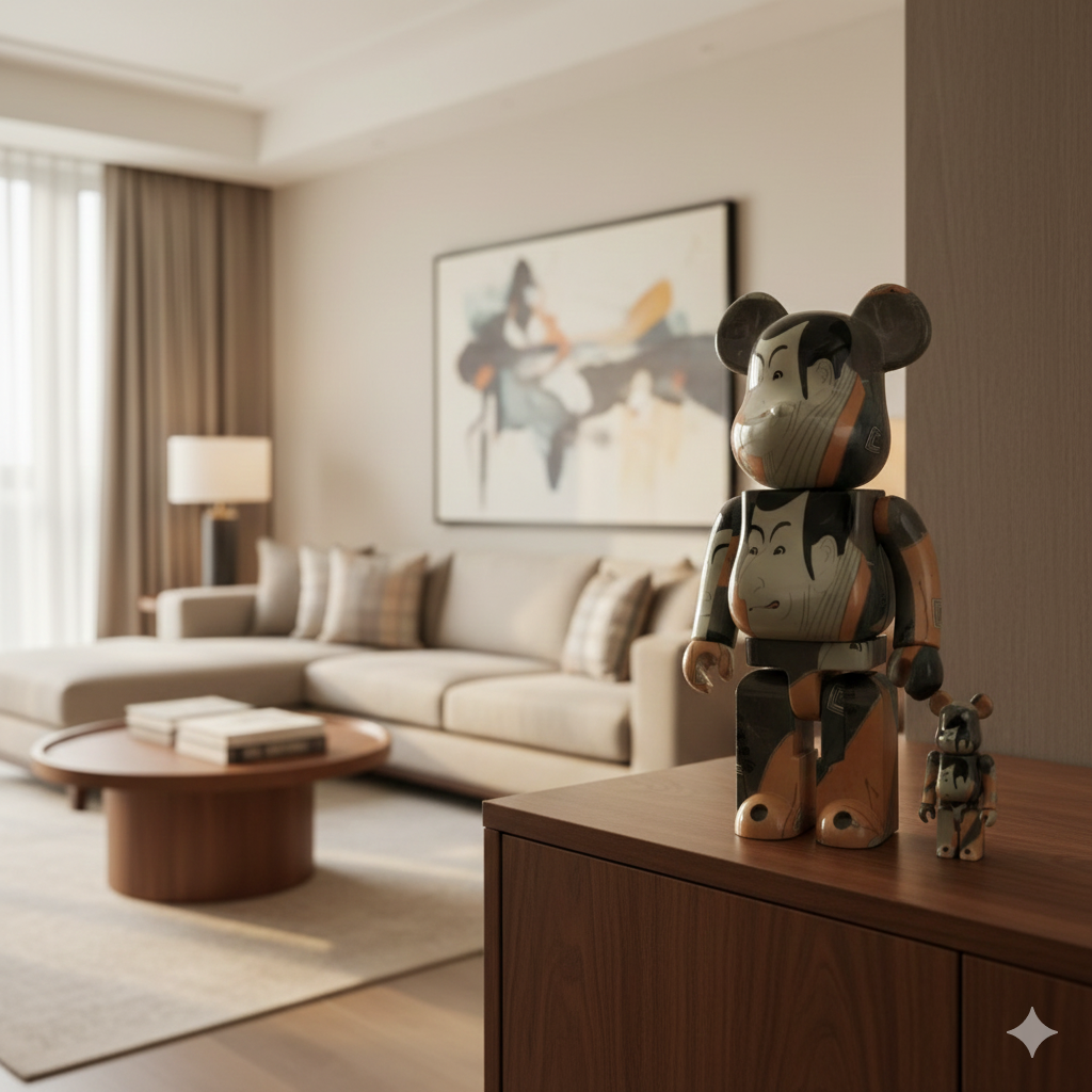 The 400% Bearbrick stands at approximately 28 cm (11 inches), while the 100% version measures 7 cm (2.75 inches). Together, they present an elegant and cohesive visual pairing, merging traditional aesthetics with the distinct Bearbrick silhouette. The design wraps around both figures with detailed precision, highlighting Sharaku’s signature use of exaggerated facial features and minimalist backgrounds.