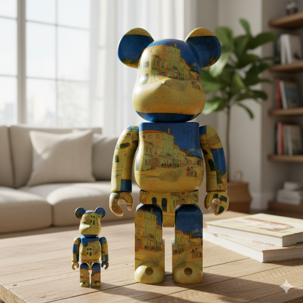 • Artistic Tribute: This Bearbrick features a full-body print of Van Gogh’s The Yellow House, a depiction of the artist’s residence in Arles, France. The vivid blue and warm golden tones highlight his signature post-impressionist style.