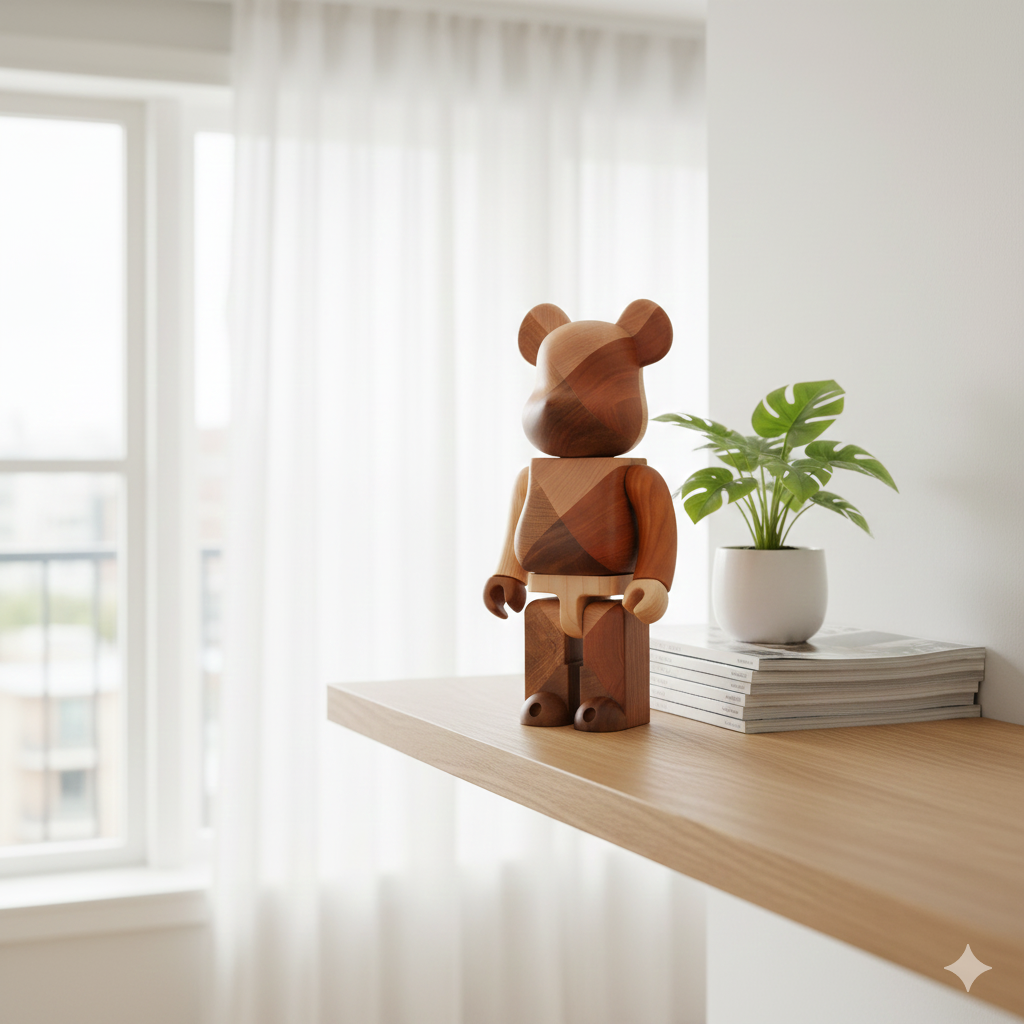 At approximately 28 cm tall, the 400% Bearbrick format offers enough size to showcase its intricate woodwork without overwhelming your space. It’s ideal for collectors who appreciate tactile craftsmanship and the quiet luxury of natural materials. Unlike mass-produced versions, this figure invites close examination — each angle revealing subtle shifts in texture and tone.