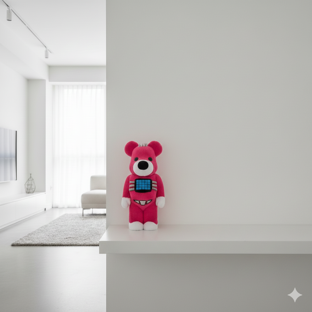 Standing at 28 cm tall, the 400% Psychobear boasts intricate details that make it a standout addition to any collection. The design includes mechanical-inspired features like ribbed metallic tubes and a central blue grid pattern on its chest, merging playful and industrial aesthetics. The spiked element on the top of the head adds a bold, rebellious flair, perfectly complementing the eye-catching pink and white palette.